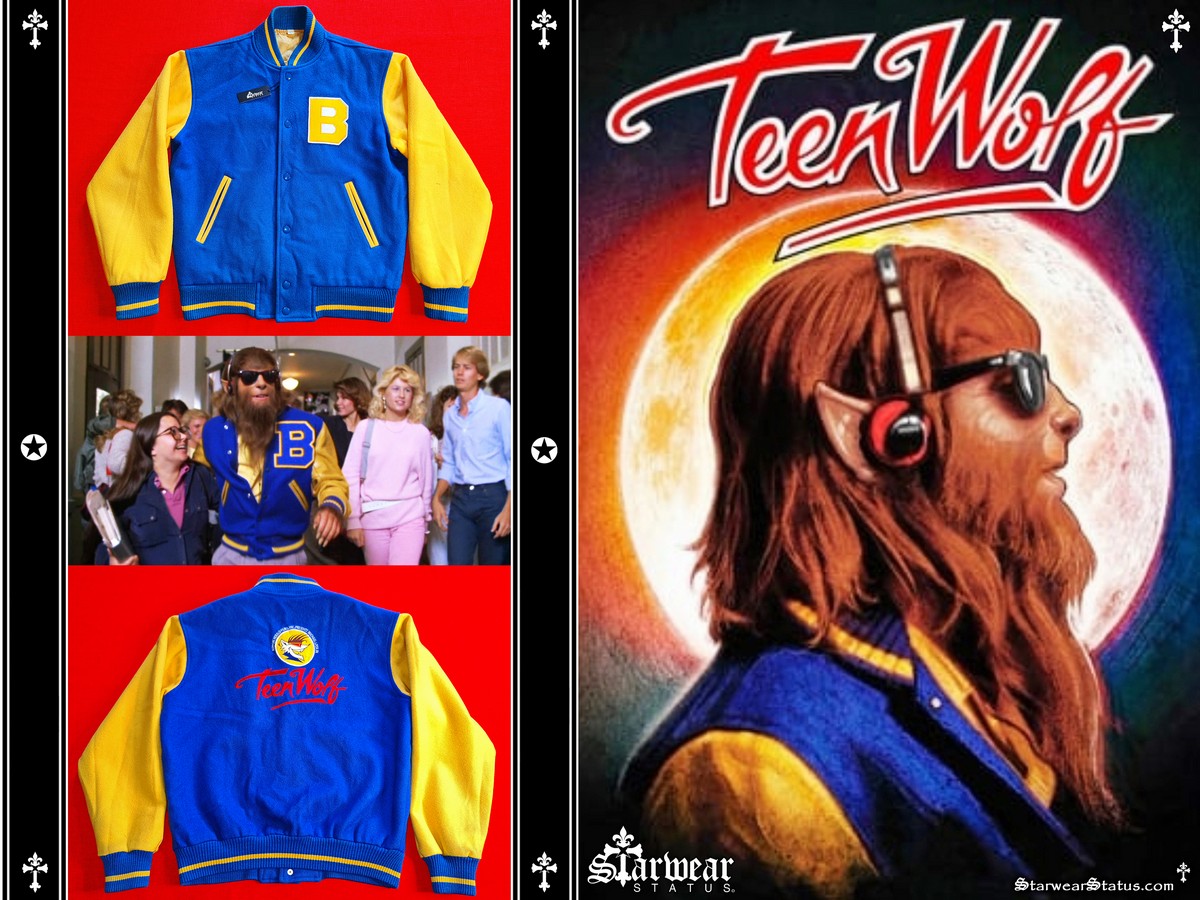 The resemblance was no coincidence. In the wake of Thriller’s unprecedented cultural impact, supernatural transformation imagery—paired with bold varsity styling—had become instantly recognisable worldwide. Teen Wolf embraced this visual language in its promotional imagery, subtly nodding to the era’s most influential pop-cultural moment while establishing its own identity. Fox’s transformation into a werewolf, framed through varsity-jacket iconography, helped cement the jacket as a lasting symbol of 1980s youth, rebellion, and cinematic fantasy.