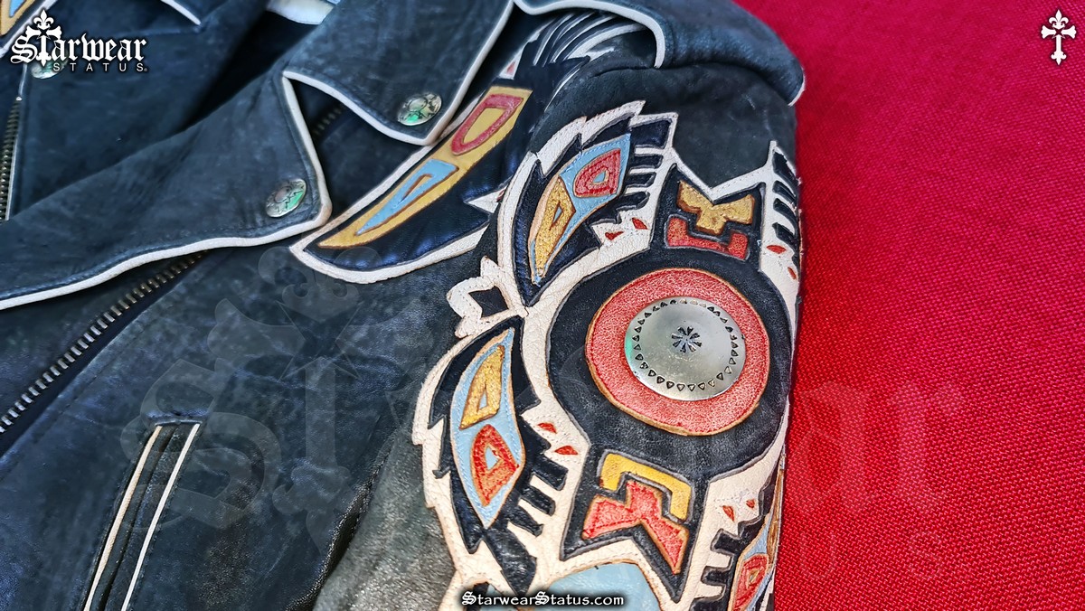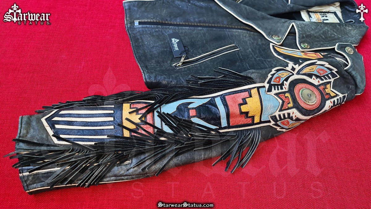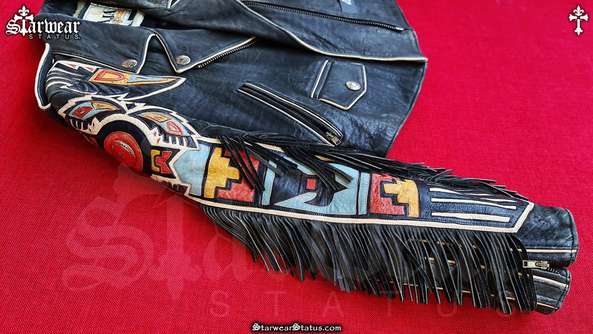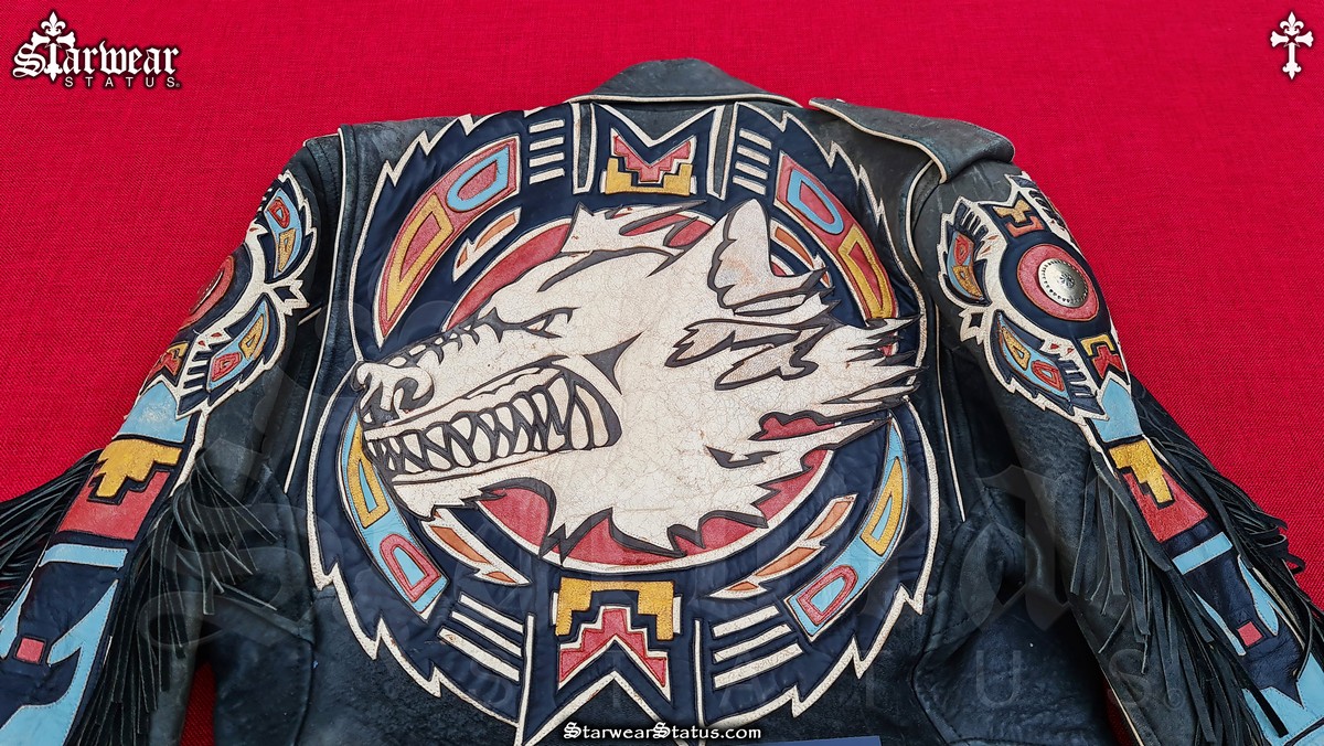 **This is An INCREDIBLE One Of A Kind, TIMELESS Piece used exclusively for Starwear Status Fashion campaign!** Embossed Leather WOLF Artwork Design with Fringed Detailing and Large Silver Stud Accents. Has Incredible Craftsmanship and attention to detail! – In Flawless Condition!! – THIS IS AN EXCLUSIVE VINTAGE 80’S DESIGNER PIECE BY BAJA TRADING COMPANY!