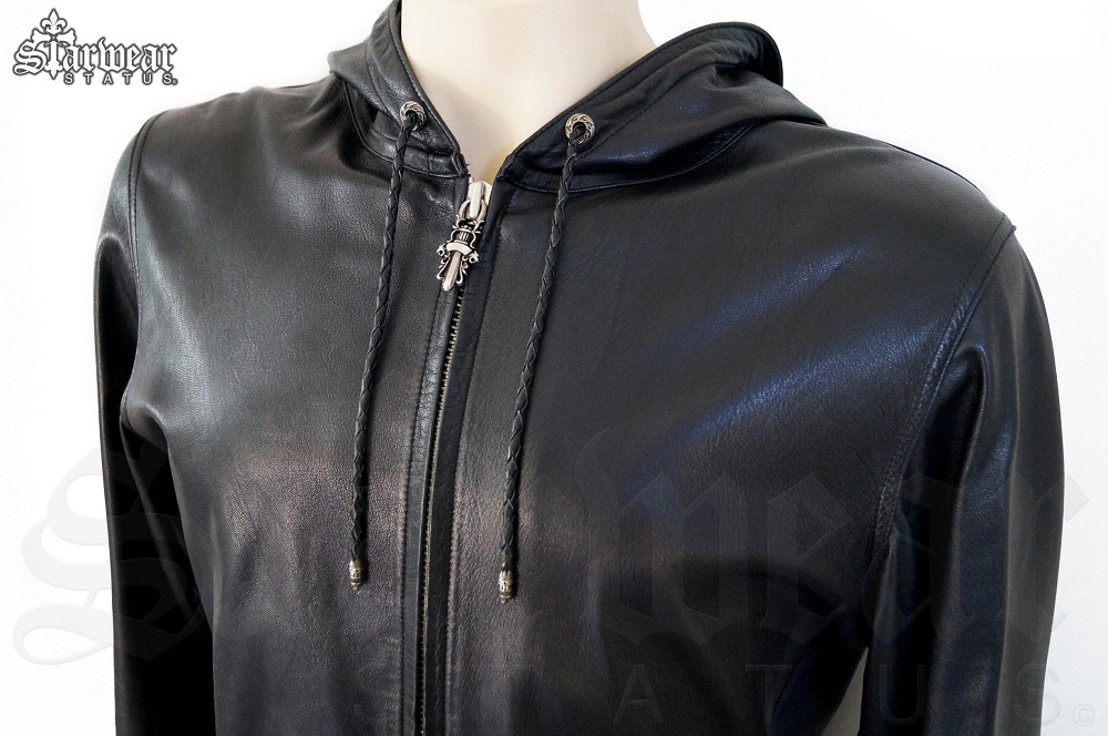 This is FABULOUS Men’s “A&G Cashmere” Hooded Jacket embellished with Solid Sterling Silver Hardware Details which includes Bolo-Tips, Large Dagger Zipper Pull on Leather braided drawstrings, a Large Cross Stud on the hood and A&G branded plaque that have all been antiqued. The Jacket also has Several LEATHER CROSSES ON THE SLEEVES AND SIDES OF JACKET. Included is one LARGE GORGEOUS LEATHER PHOENIX ON THE BACK. It has 2 Outer pockets and the jacket is made of 100% Leather. It is in very good condition, with no holes..