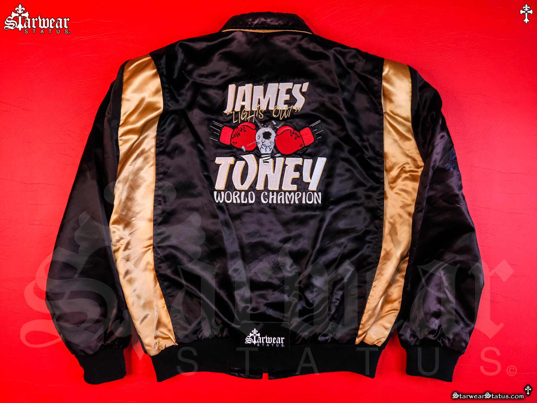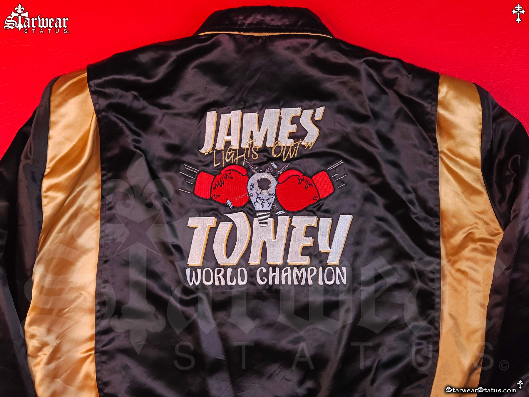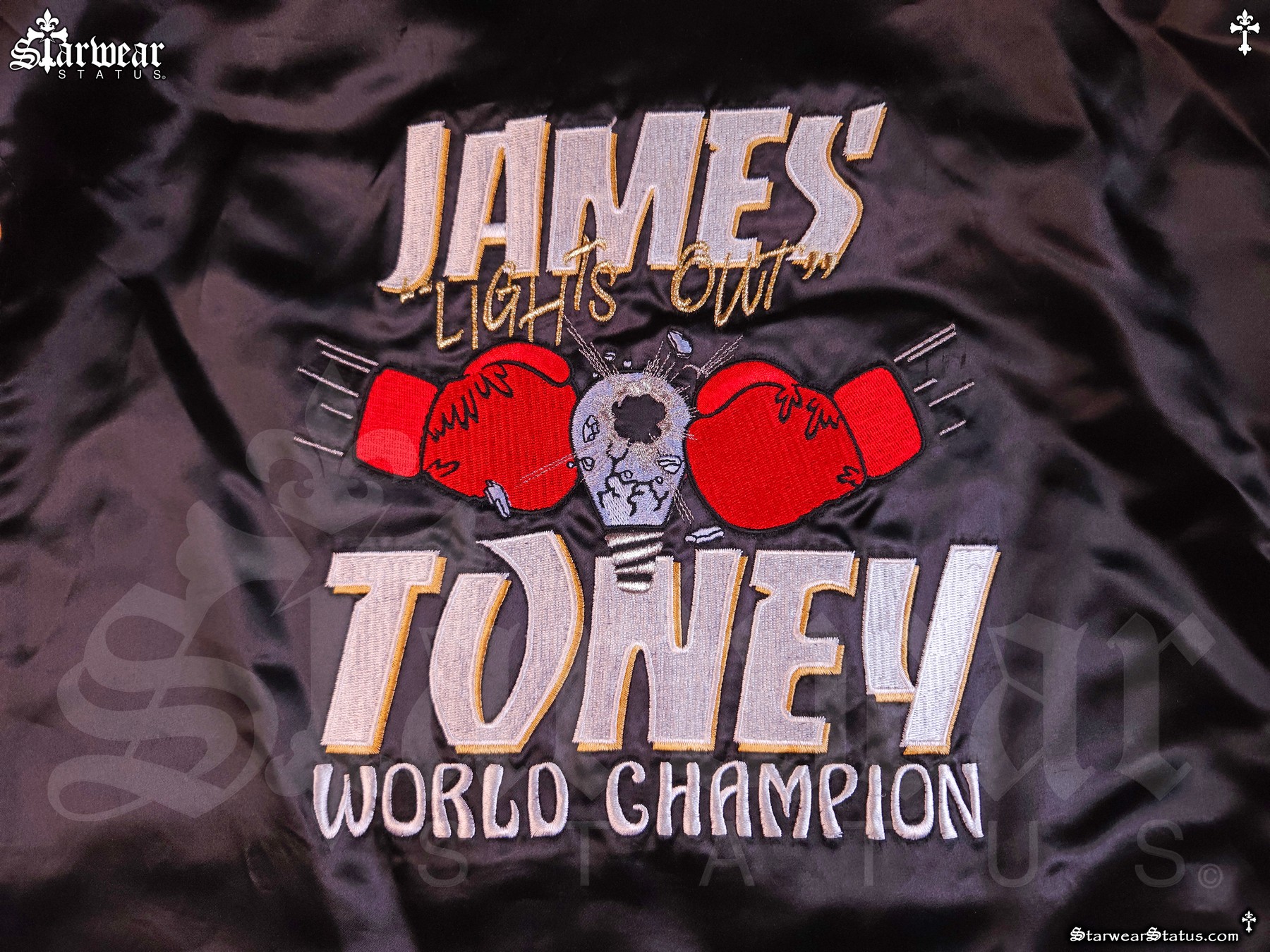 BACK DETAILS: STRIKING EMBROIDERY READING “JAMES ‘LIGHTS OUT’ TONEY – WORLD CHAMPION” WITH A POWERFUL DESIGN OF A BOXING GLOVE SMASHING A LIGHT BULB, SYMBOLIZING HIS FAMOUS NICKNAME.