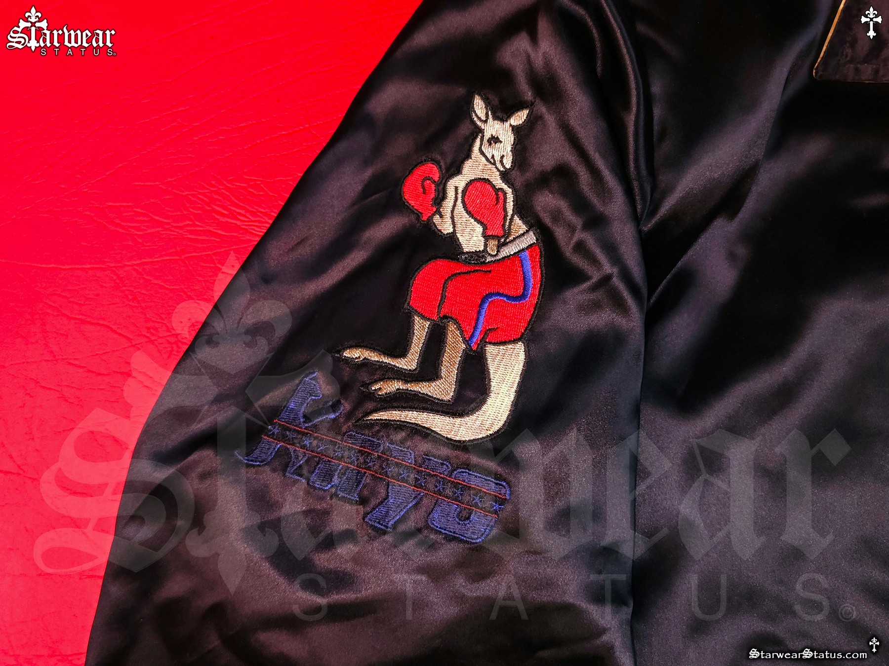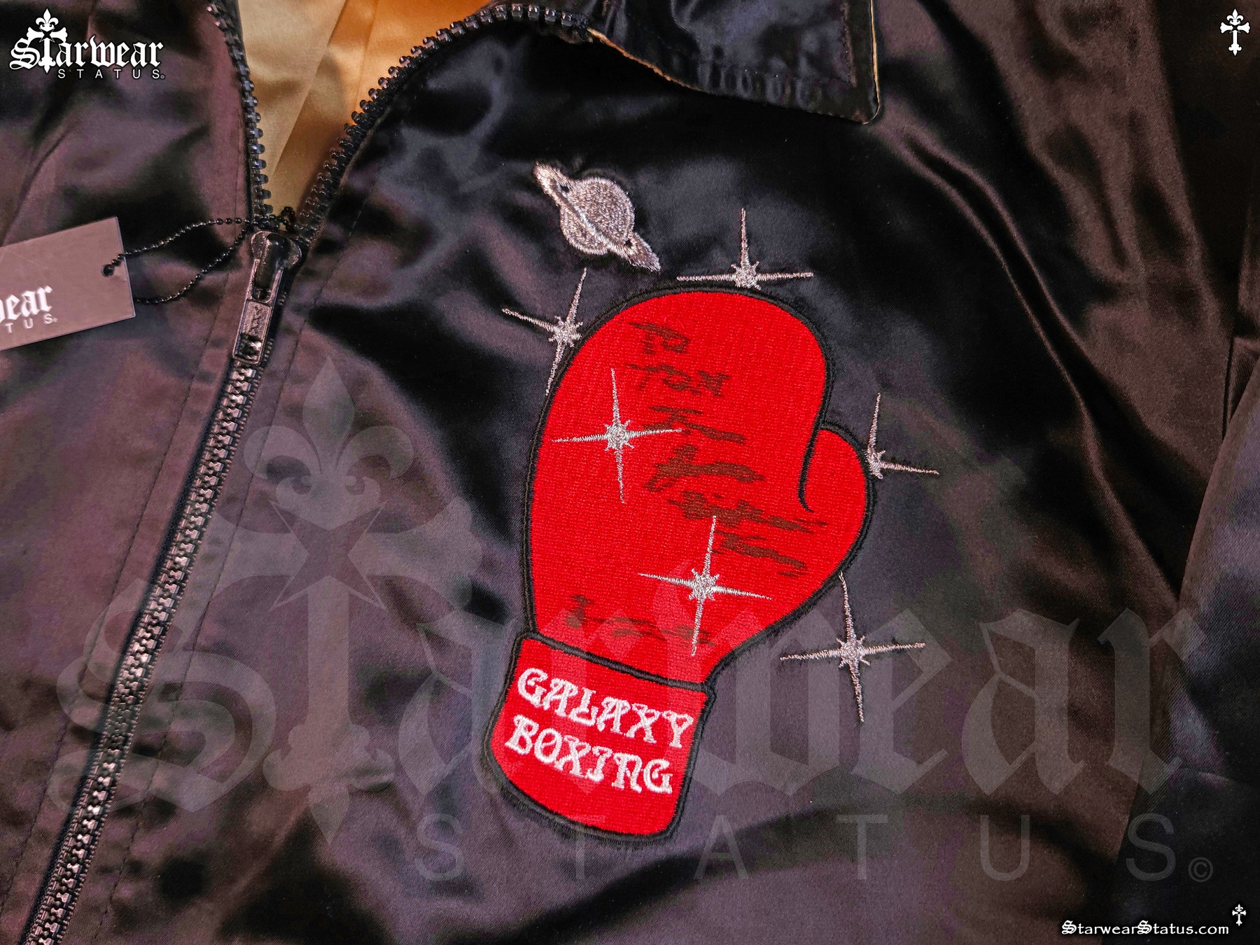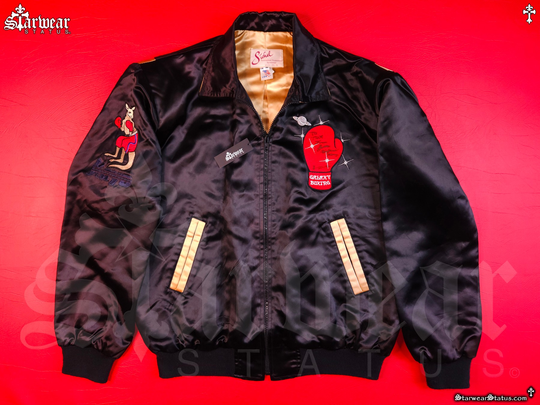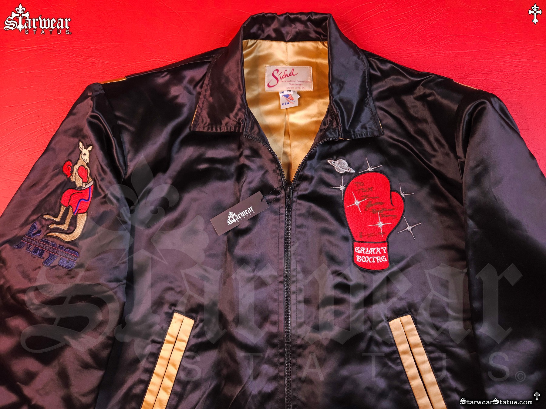 - FRONT DETAILS: EMBROIDERED RED BOXING GLOVE WITH GALAXY BOXING LOGO, PERSONALLY SIGNED BY JAMES TONEY, ALONGSIDE THE ICONIC KO KANGAROO “KAYO” PATCH.