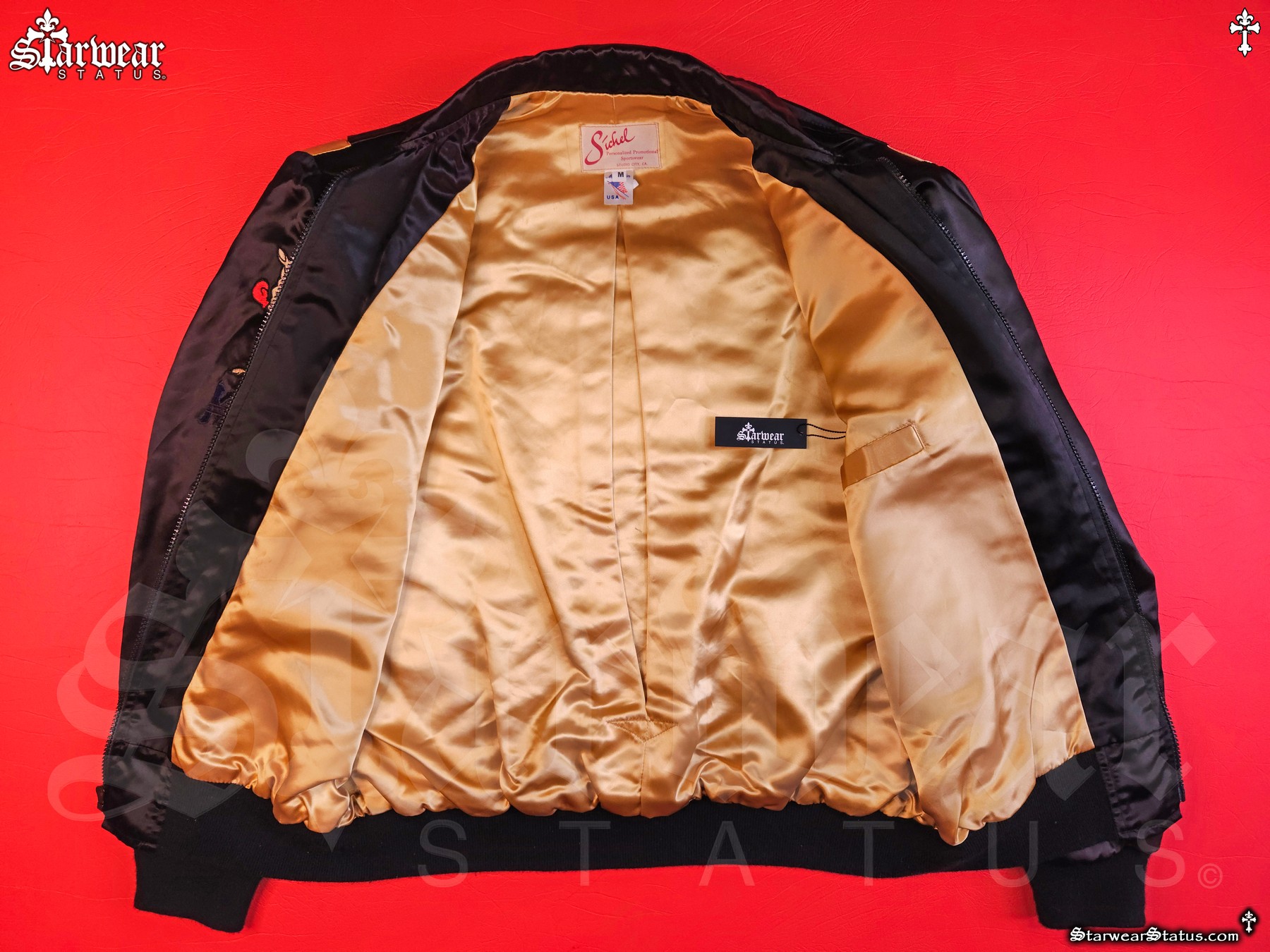 STYLE: SLEEK BLACK SATIN WITH BOLD GOLD SLEEVE PANELS, GOLD-TRIMMED POCKETS, AND RIB-KNIT CUFFS AND WAISTBAND. - ☆ COLLECTABILITY: INVEST IN A COLLECTIBLE GARMENT THAT APPRECIATES IN VALUE OVER TIME, TRANSCENDING TYPICAL DESIGNER TRENDS – NEVER SOLD or RELEASED TO GENERAL PUBLIC. – THIS IS AN 100% ORIGINAL PIECE GIFTED EXCLUSIVELY TO JAMES TONEY!