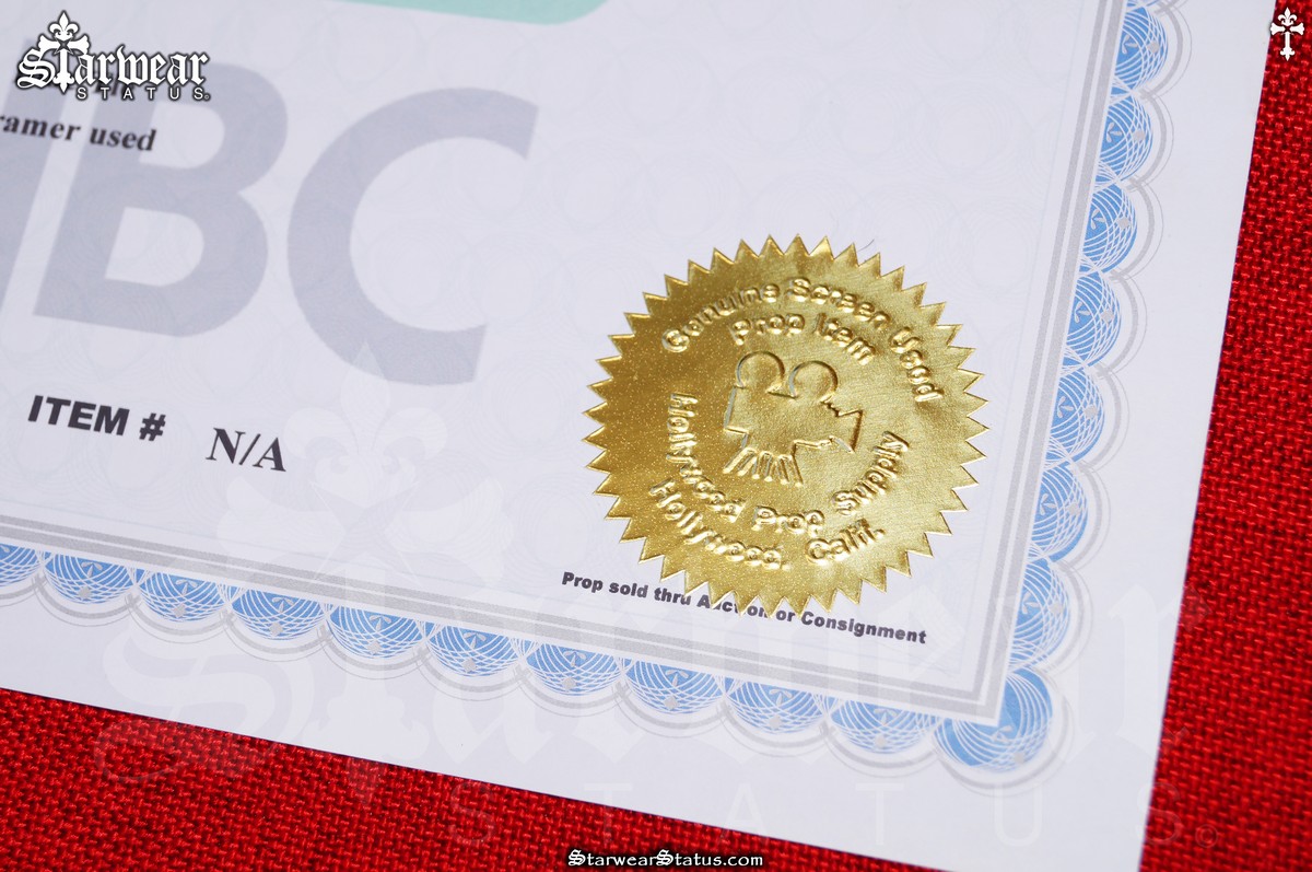 NBC (CERTIFICATE OF AUTHENTICITY) – TV NETWORK “NBC” COA FEATURES HOLOGRAPHIC NUMBERING STICKER AND HOLLYWOOD PROP SUPPLY “CERTIFIED GOLDEN STICKER”.