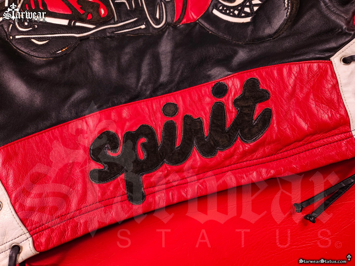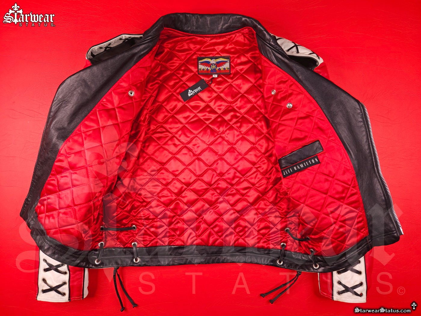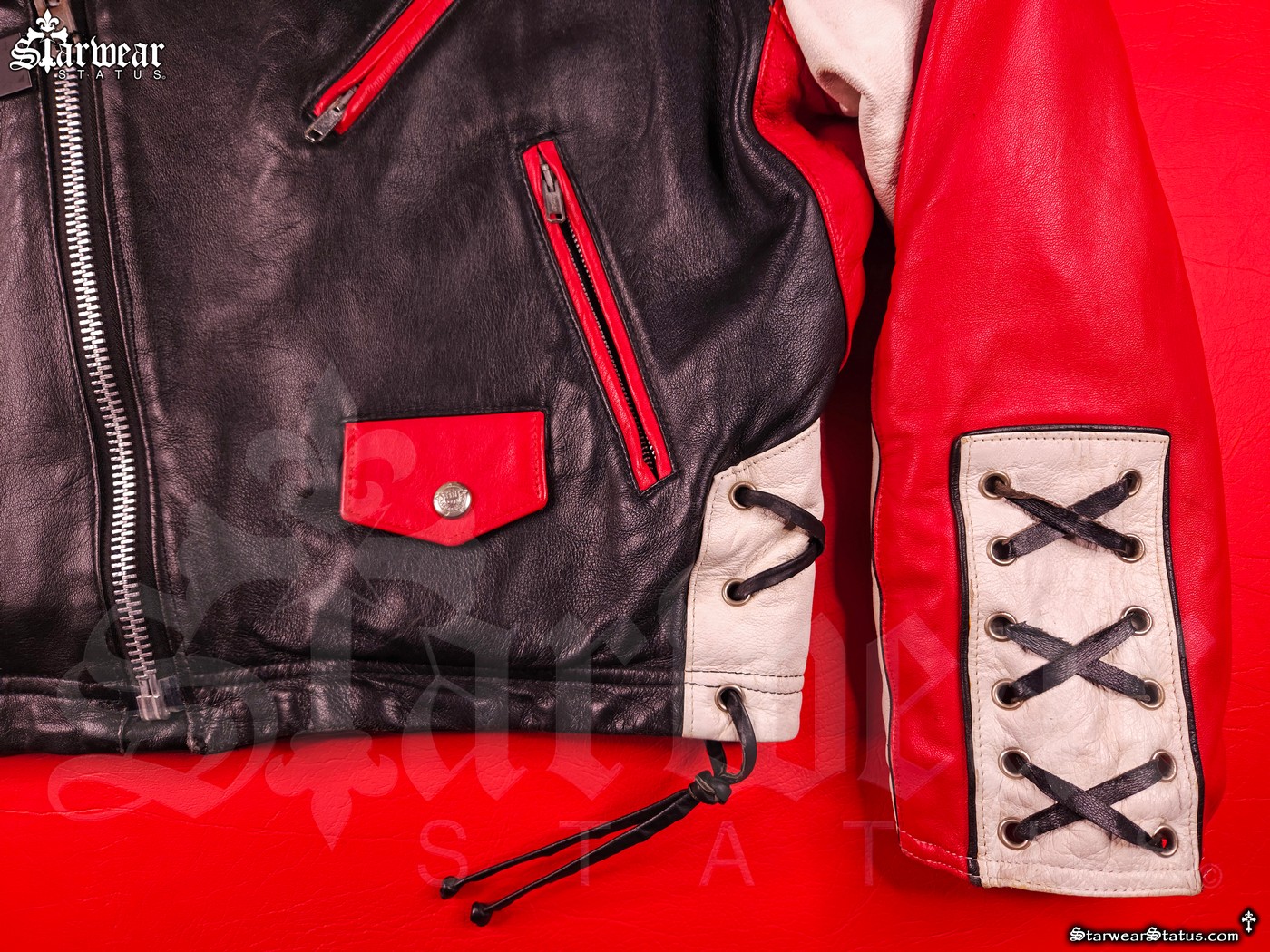 Crafted by world-renowned designer Jeff Hamilton, this jacket showcases his signature bold artistry and premium craftsmanship. Featuring a striking red, black, and white leather panel design with lace-up detailing on the sleeves and sides, this jacket is instantly recognizable as a Jeff Hamilton collectible.