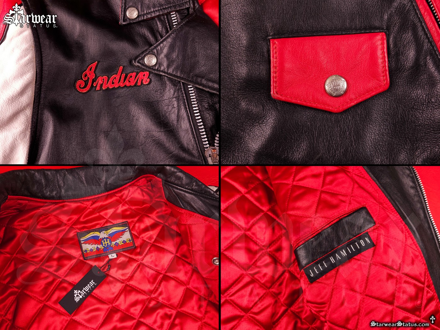The back panel features a hand-cut and stitched leather Indian Motorcycle graphic, complete with the “Indian Spirit” lettering – an authentic tribute to the legendary motorcycle brand. The front carries the embroidered Indian logo, alongside Hamilton’s unmistakable design language that made his jackets a staple among celebrities, athletes, and collectors worldwide.
