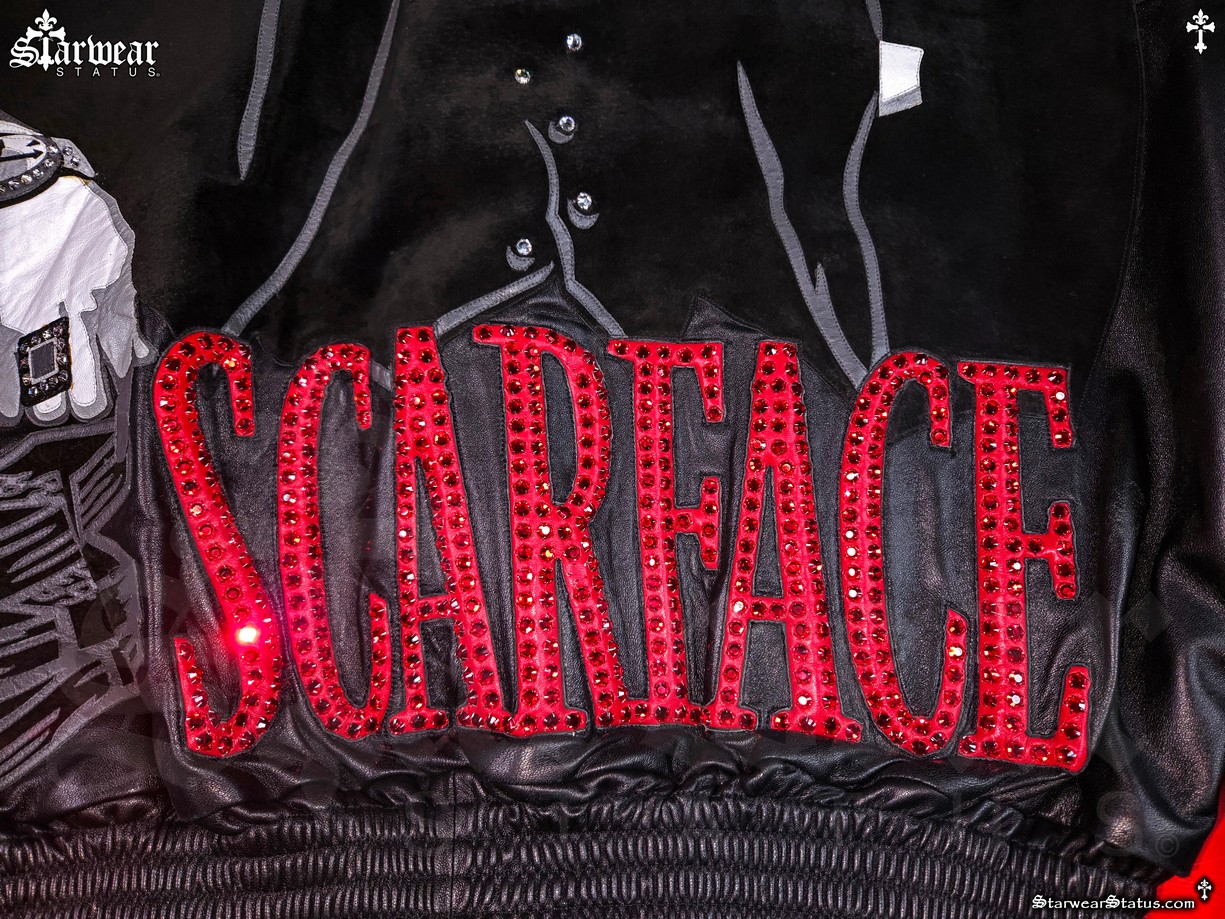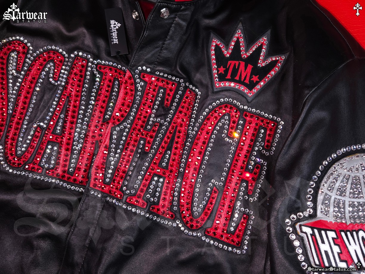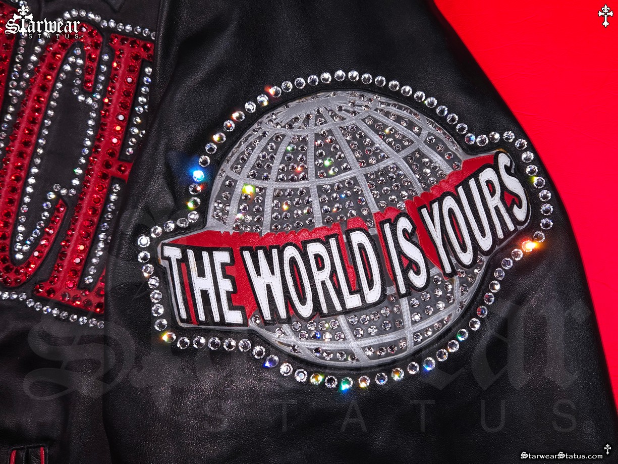 - 💎 Emblazoned with hundreds of hand-set Swarovski crystals shimmering across the bold Scarface lettering, crown, and globe, this commanding 4XL masterpiece radiates brilliance and presence. Every stitch, patch, and detail was crafted to embody “The World Is Yours,” “Power, Money, Respect,” and the unforgettable dominance of Tony Montana.