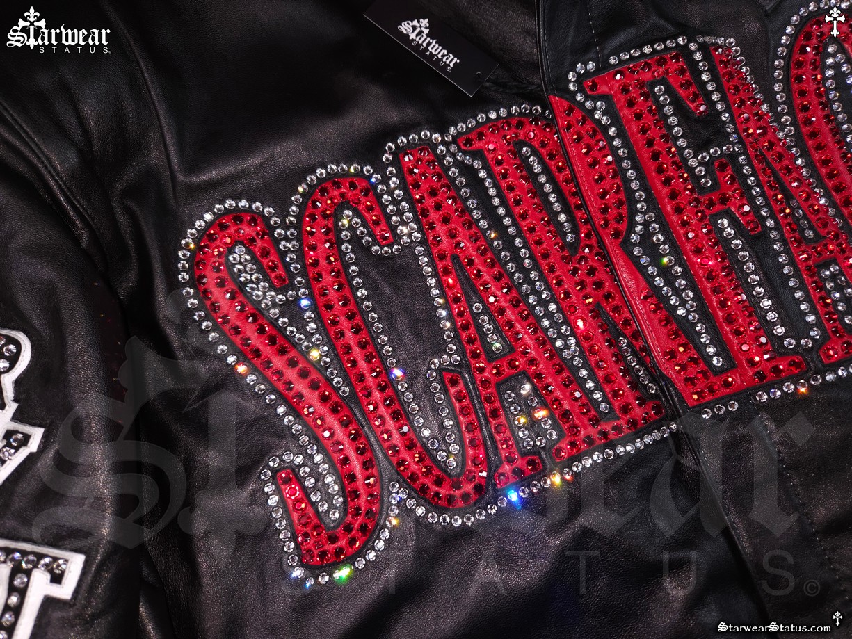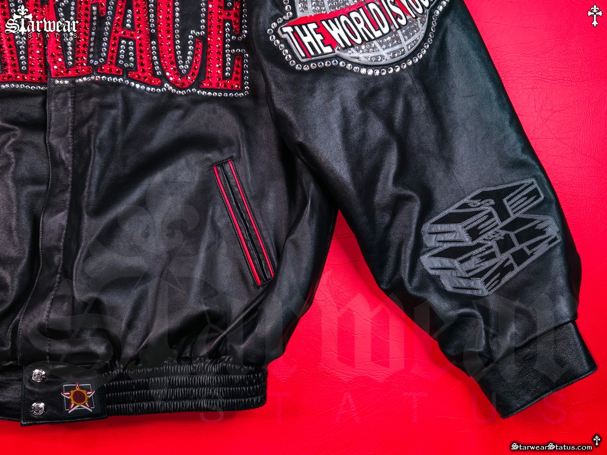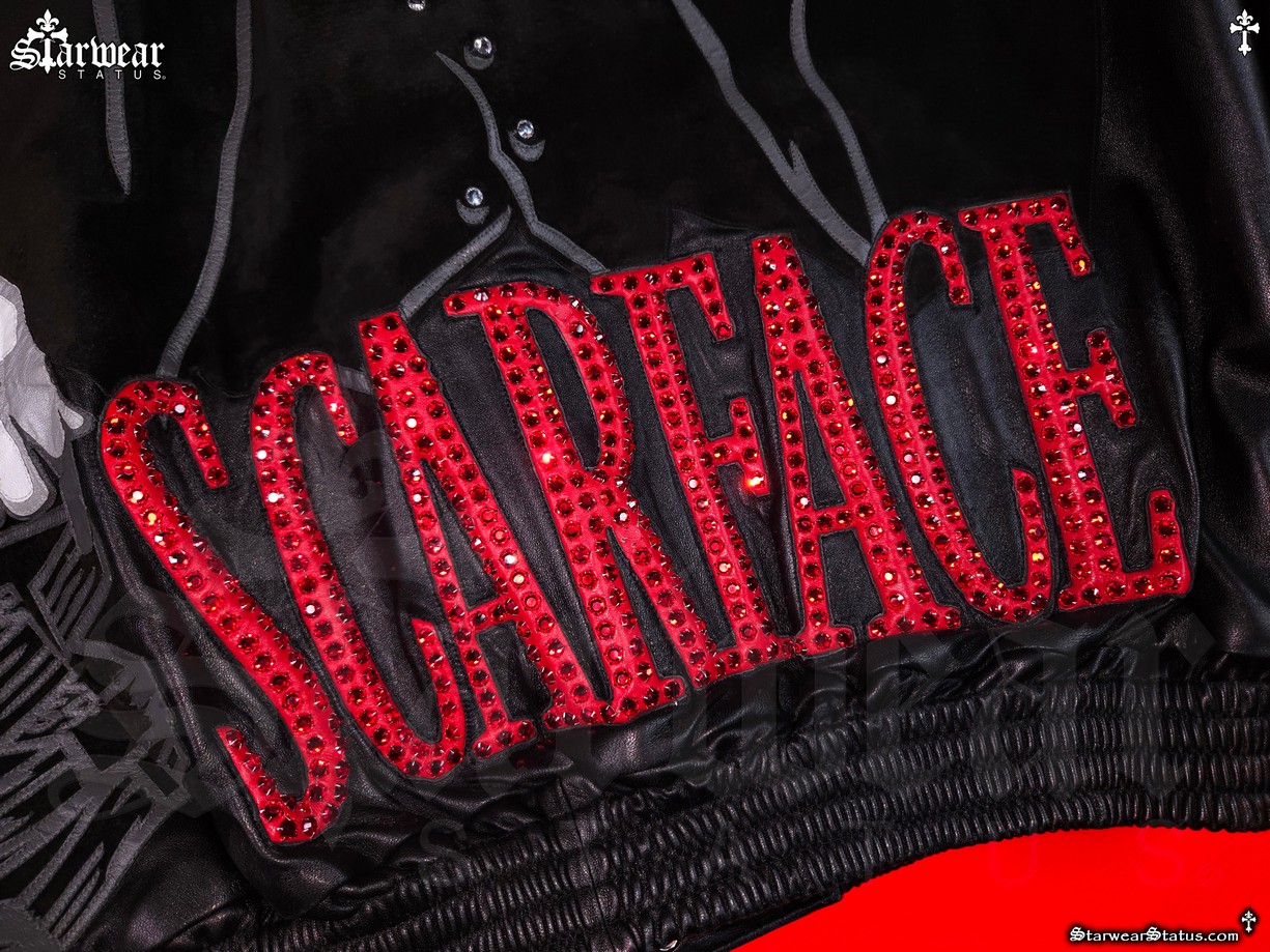 - 💎 Emblazoned with hundreds of hand-set Swarovski crystals shimmering across the bold Scarface lettering, crown, and globe, this commanding 4XL masterpiece radiates brilliance and presence. Every stitch, patch, and detail was crafted to embody “The World Is Yours,” “Power, Money, Respect,” and the unforgettable dominance of Tony Montana.